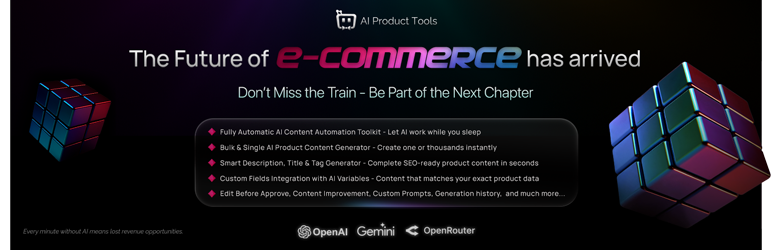 AI Product Tools is a powerful WooCommerce plugin that leverages artificial intelligence to revolutionize your product content workflow. With bulk description generation, intelligent title creation, smart tagging, and unlimited access to FREE AI models through OpenRouter integration, AI Product Tools eliminates manual writing while maximizing your store’s SEO impact and sales performance.